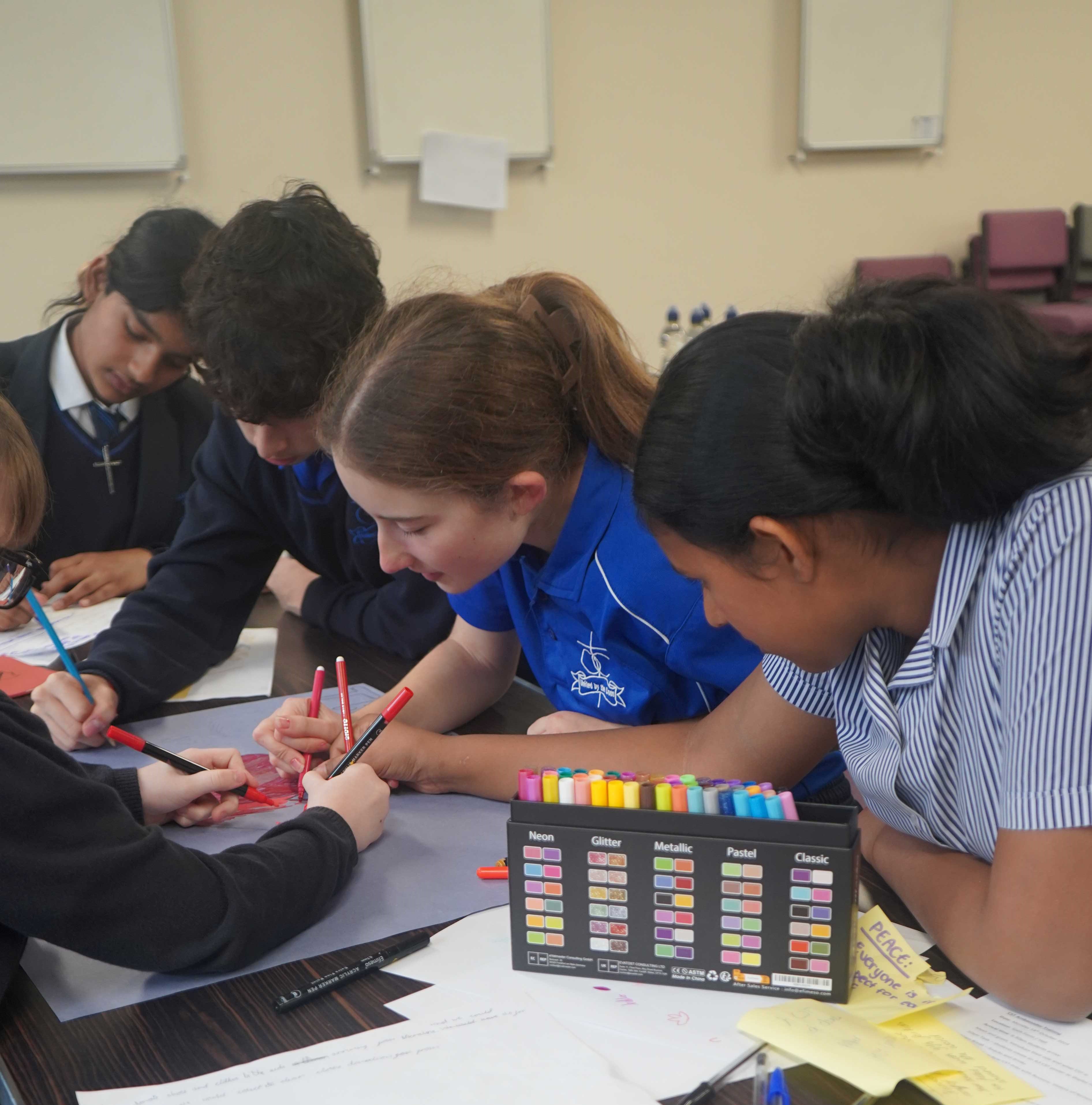 We also run Catholic Social Teaching (CST) Ambassador events for Year 5 and 6 students from our feeder Catholic primary schools. During these events, primary school students are supported by Oaklands Student Leaders to share the ways their schools already enact the principles of CST and discover new ideas that they are keen to take back to their schools and try to implement. These small groups learned over the course of the day about what the principles of CST are; who Oscar Romero is; and how to create and lead their own worship.