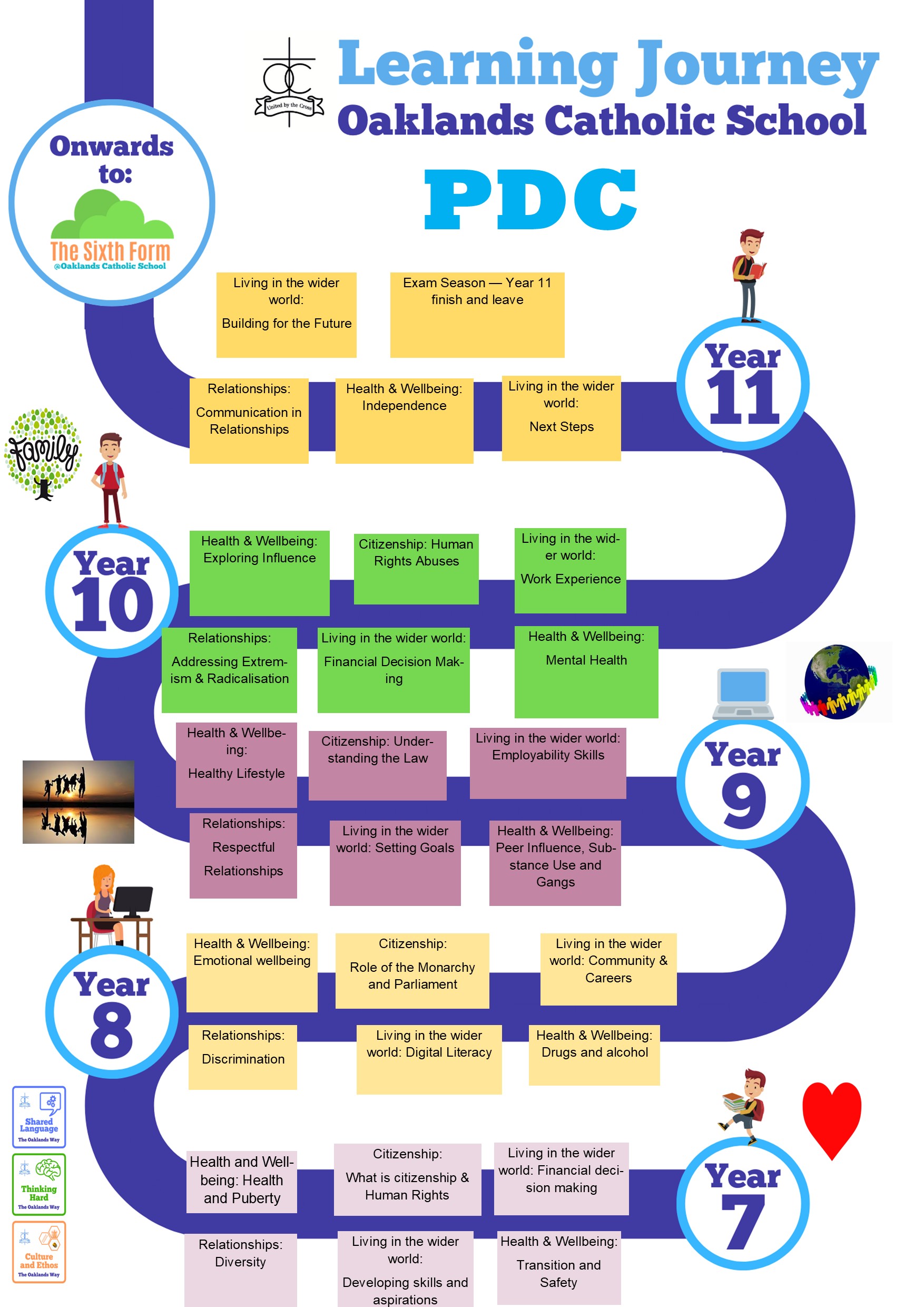 The fundamental aim of the Personal Development Curriculum (PDC) at Oaklands is to prepare students holistically so that they can live life to its fullest. Our curriculum content aims to help children and young people grow to their full potential and attain a greater sense of responsibility in preparation for future life. Since January 2020 we have consulted* with parents on the content of the PDC and RSE curriculum. Stripped through our curriculum there are a number of themes that develop in students the principles of Catholic Social Teaching.