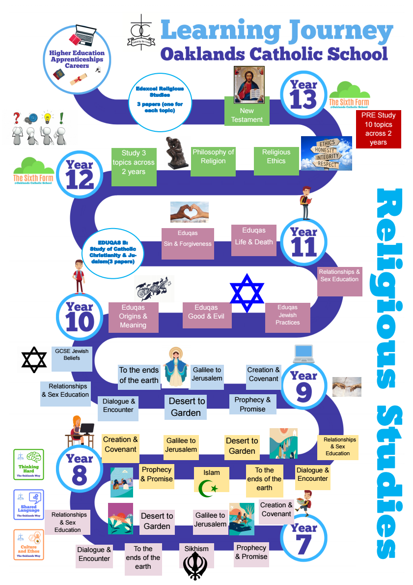 We aim at deepening young people’s knowledge, understanding and effective appreciation of the Catholic faith tradition, of other religions and of contemporary religious moral and philosophical issues. Our curriculum is coherently planned and builds upon the ‘God Matters’ programme used by Portsmouth Diocesan schools at Key Stage 2, developing increasingly detailed and varied knowledge about a range of traditions and faiths, including the Christian, Sikh, Muslim and Jewish faiths. We also recognise that some students have experienced a different curriculum at Key Stage 2, prior to Oaklands, especially if they come from a non-Catholic feeder school, and therefore core Christian beliefs and practices as well as essential thinking skills are taught early in the Key Stage 3 curriculum.